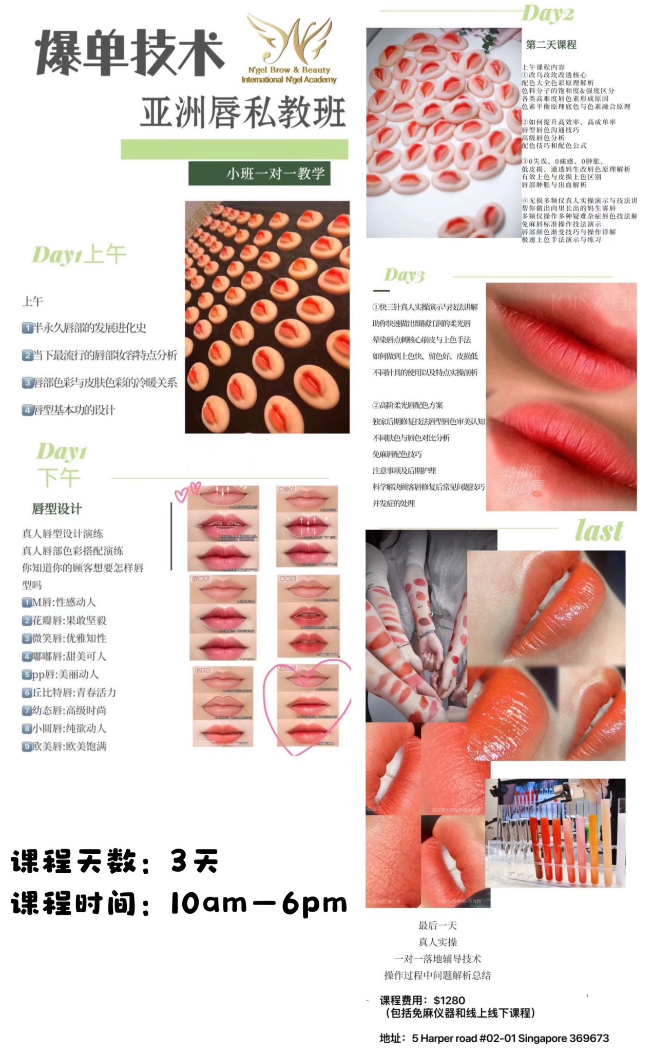 第一天:课程了解唇基本知识,唇色彩和皮肤搭配,唇形基本功设计; 第二天:改唇色课程,色彩配色公式,疑难杂症,快速上色技法的解答; 第三...