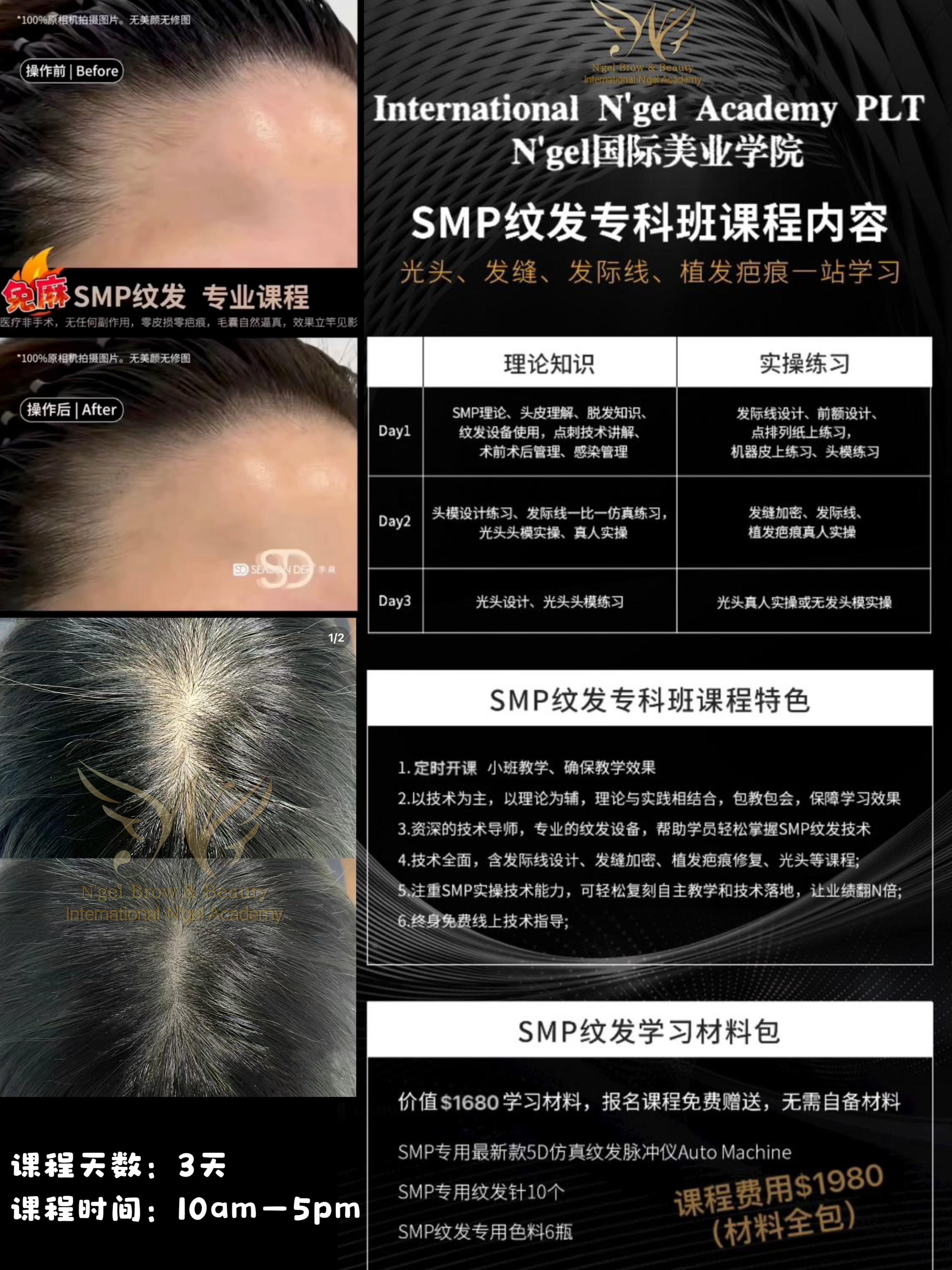 Day1:SMP理论、头皮理解、脱发知识、纹发设备使用,点刺技术讲解、木前术后管理、感染管理(实操练习:发际线设计、前额设计、点排列纸上练习、...